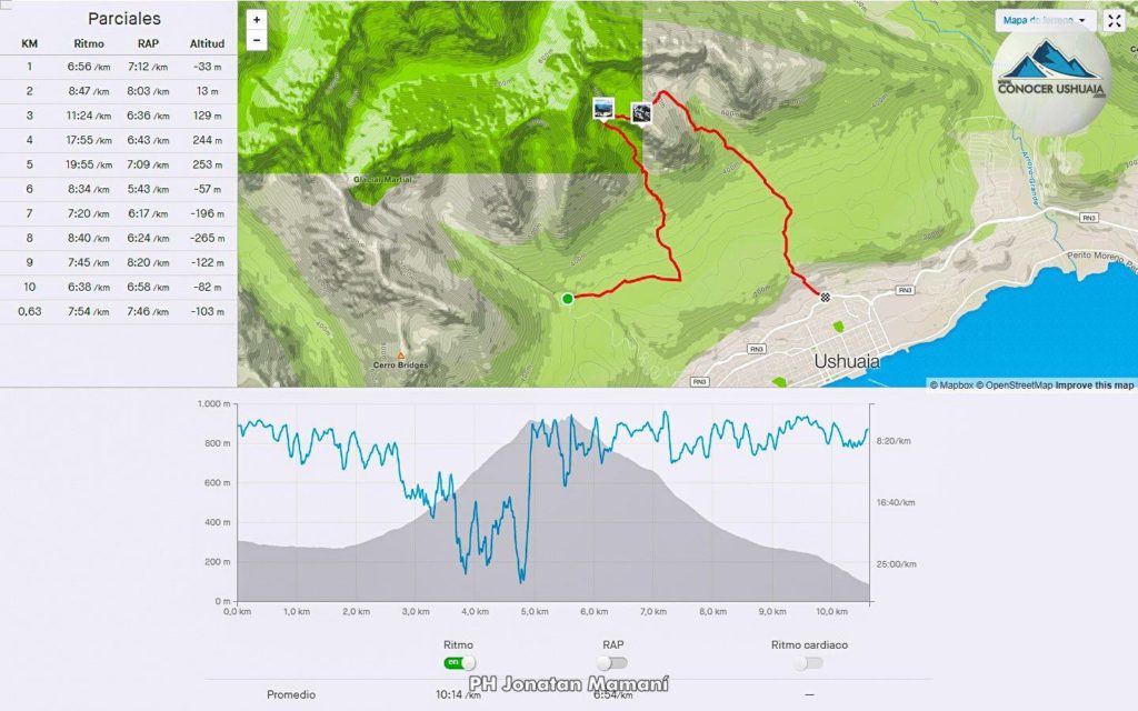 Un excelente entrenamiento cortando la semana al medio. Un circuito que se puede realizar en modalidad trail running y/o caminando. Arrancamos desde el glaciar martial (cerca de la casita de te), continuando por el turbal que va por la picada de los hacheros y desde ahí empezamos el ascenso al cerro del medio por su lateral oeste hasta llegar a su punto más alto. A partir de ahí comenzamos el descenso por el sendero tradicional al mismo hasta llegar al hotel Ushuaia que fue donde finalizamos el recorrido.