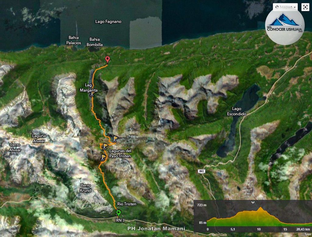 Arrancamos caminando casi 1kms antes de llegar al camping del río tristen (viniendo de Ushuaia), dejamos el auto en un estacionamiento que se encuentra sobre el costado de la RN3 y terminamos en la cabecera norte de Laguna Margarita, a escazos metros del Lago Fagnano. Hubo un par de cruces de río, es casi imposible no mojarse los pies. El paso tristen parecia otro mundo, las lagunas que lo componían eran una mejor que otra. En total fueron un poco más de 20kms recorridos de ida; para realizar esta travesía se debe prever dejar otro medio de transporte en la laguna margarita para retornar al punto de inicio por la ruta. Desde la laguna margarita hasta la RN3 son 17kms aprox y desde ahi hasta el inicio del sendero otros 26kms mas, por este motivo la logística es súper importante (también se puede volver a dedo).