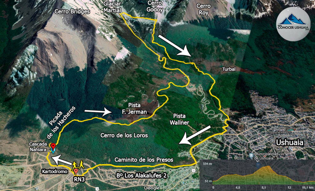 Trail running en el fin del mundo recorriendo los mejores paisajes en los senderos de Tierra del Fuego. En esta oportunidad dimos una vuelta de aproximadamente 16kms contemplando la cascada Nahiara, Glaciar Martial, entre otros. Iniciamos la travesía en el kartodromo de la ciudad (RN3 camino al parque nacional) a pocos metros de ahí interceptamos la cascada Nahiara para luego comenzar el primer ascenso por la picada de los hacheros hasta llegar a la base del Glaciar Martial. Seguimos ascendiendo hasta el mirador del Glaciar y desde ahí tomamos la senda del Filo hasta el final para luego comenzar el descenso por una senda convencional hasta cercanías de la planta potabilizadora de la ciudad. Retornamos al punto de inicio tomando el clásico caminito de los presos.