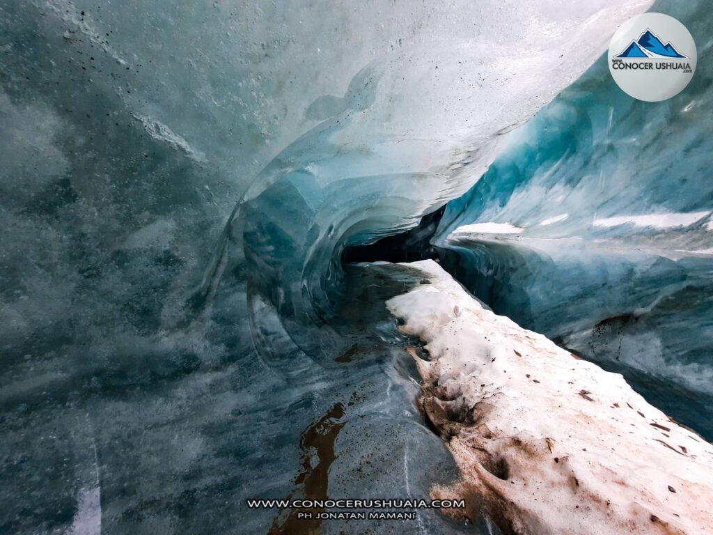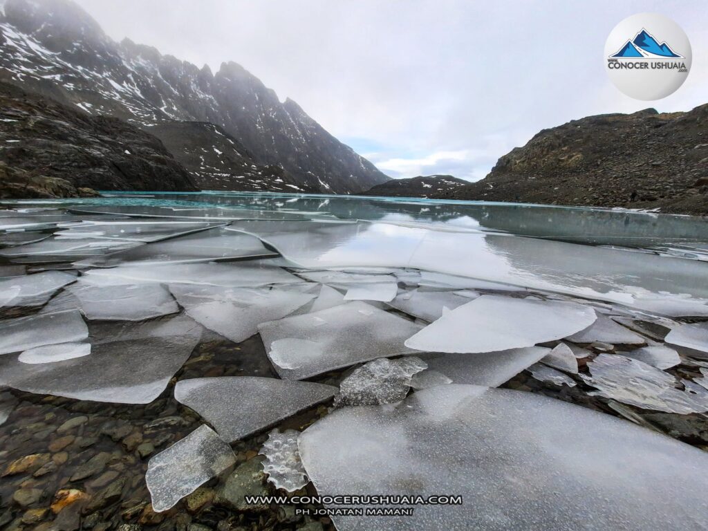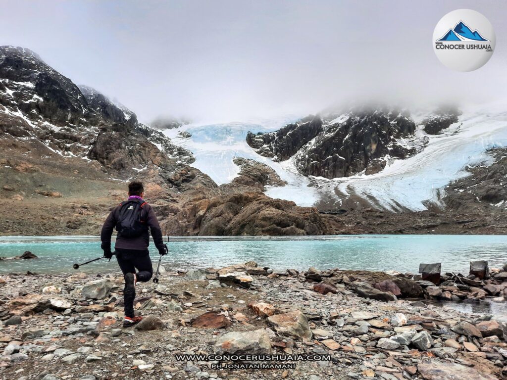 Bajo la modalidad trail running llegamos hasta la Laguna de los Tempanos y la base del Glaciar Vinciguerra. En los últimos días antes de la llegada del invierno oficial en Ushuaia decidimos emprender esta travesía.La senda inicia en la tranquera que se encuentra al final del valle de andorra (ver mapa), los primeros 2kms se transitan por el turbal del valle (sin mayor desnivel) hasta cruzar el Arroyo Grande, a partir de ahi comienza un ascenso continuo hasta la laguna (+3kms). Hay barro por sectores pero con un buen calzado todavía puede transitar sin inconvenientes (el turbal siempre es húmedo y es inevitable no mojarse los pies). Al llegar a la base del Glaciar Vinciguerra encontramos una grieta muy llamativa e impactante (ver fotos), se debe tener extremo cuidado al acercarse a la misma; si no se tiene experiencia en montaña y glaciares se recomienda ir con un guía especializado para realizar este tipo de travesías.