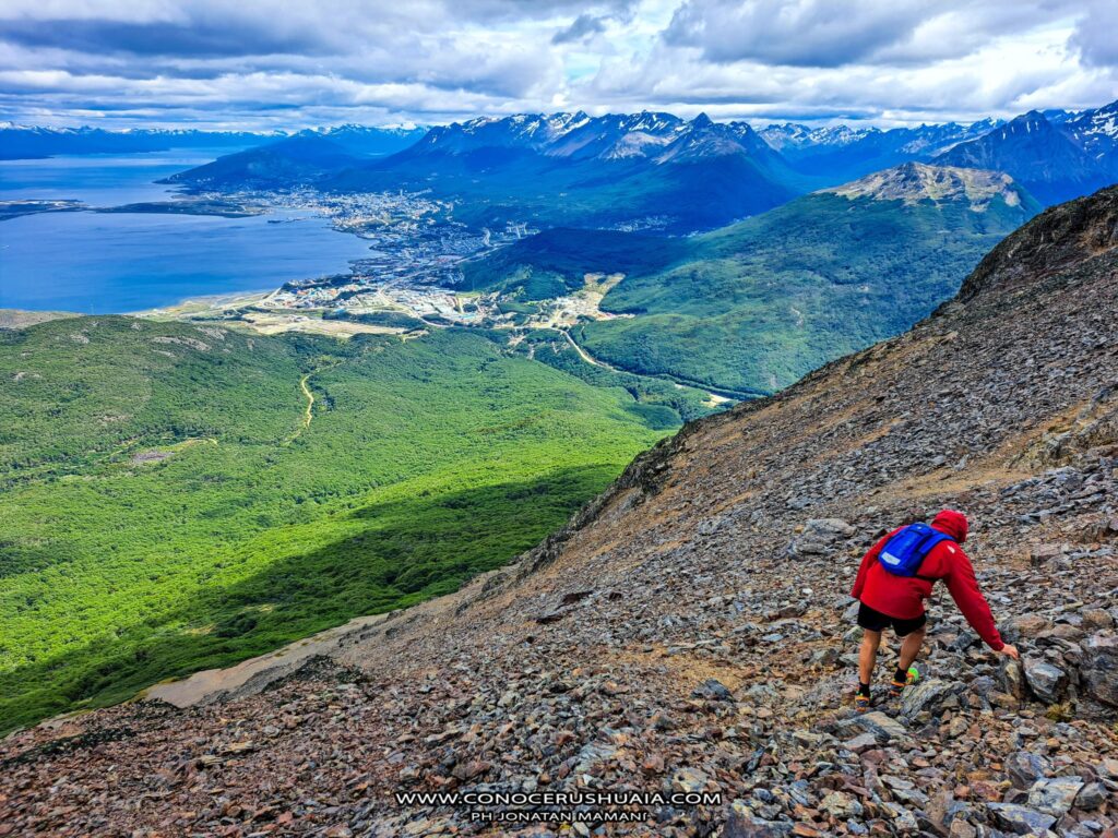 Decidimos descender por su cara Este: realmente se debe ir con extremo cuidado por la pendiente y el acarreo que posee (es de dificultad difícil). Al llegar al bosque, como no hay un sendero establecido, se debe avanzar a bosque traviesa hasta llegar al camino de la Tata Fique. Desde ahí y luego de correr 2 kms más por ese camino consolidado, volvimos por una senda que bordea el río Olivia hasta el punto de origen.