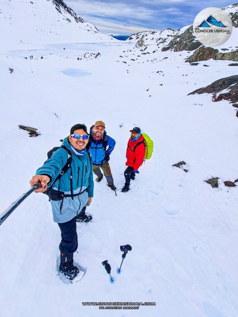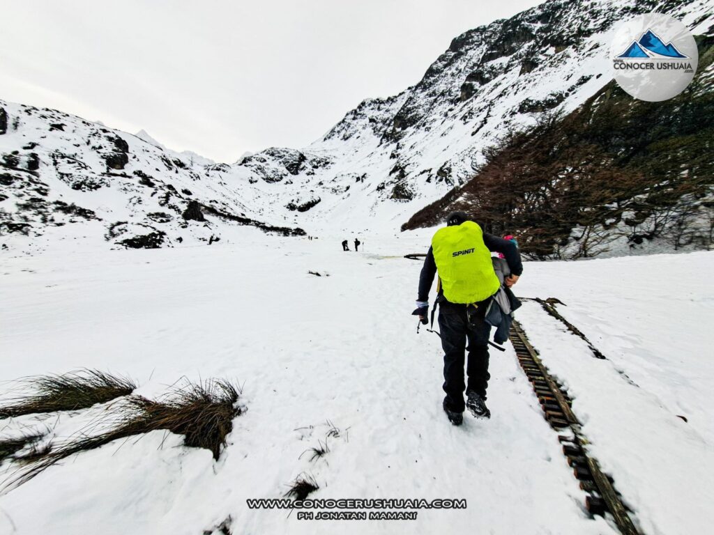 Una vez en esta maravilla de la naturaleza, el Glaciar Vinciguerra, ubicado sobre el valle de Andorra, muy cerca de la ciudad de Ushuaia. Comenzamos la actividad en la tranquera, atravesando el valle hasta cruzar un puente y empezar a ascender por un camino bastante consolidado pero con mucho hielo. Llegamos hasta la Laguna de los Témpanos (congelada) y desde allí continuamos unos metros más hasta el pie del glaciar, donde en esta época se forman impresionantes cuevas de hielo.