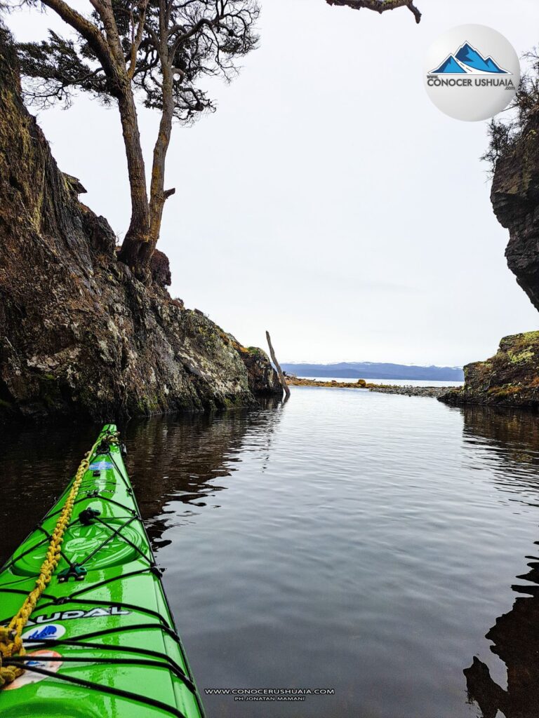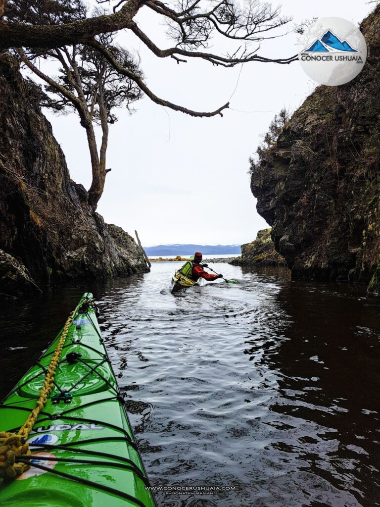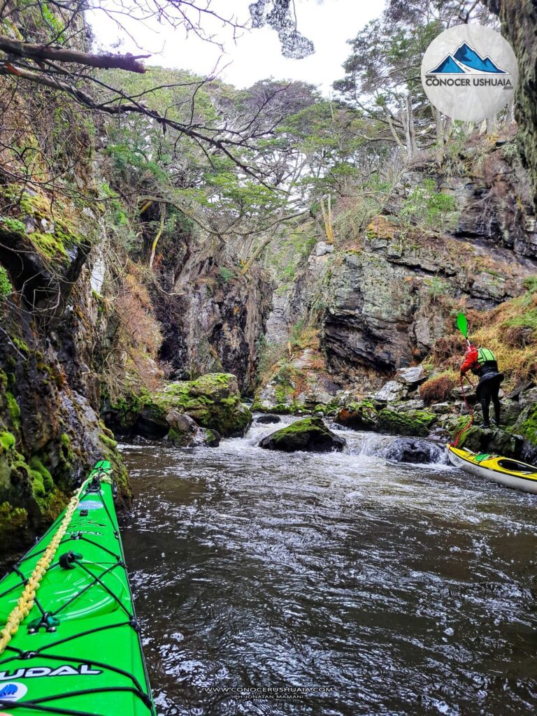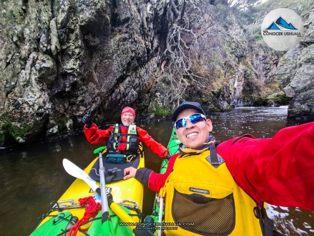 Sin querer llegamos hasta la desembocadura del Río Encajonado, pasando previamente por la Estancia Túnel y partiendo desde la desembocadura del Río Olivia (Club de Kayak Shimawaia). Remada tras remada, en 1h20 estábamos allí, donde pudimos meter los kayak y remar unos pocos metros adentro del río, apreciando las paredes de piedra que lo hacen un lugar único. 🌊🪨